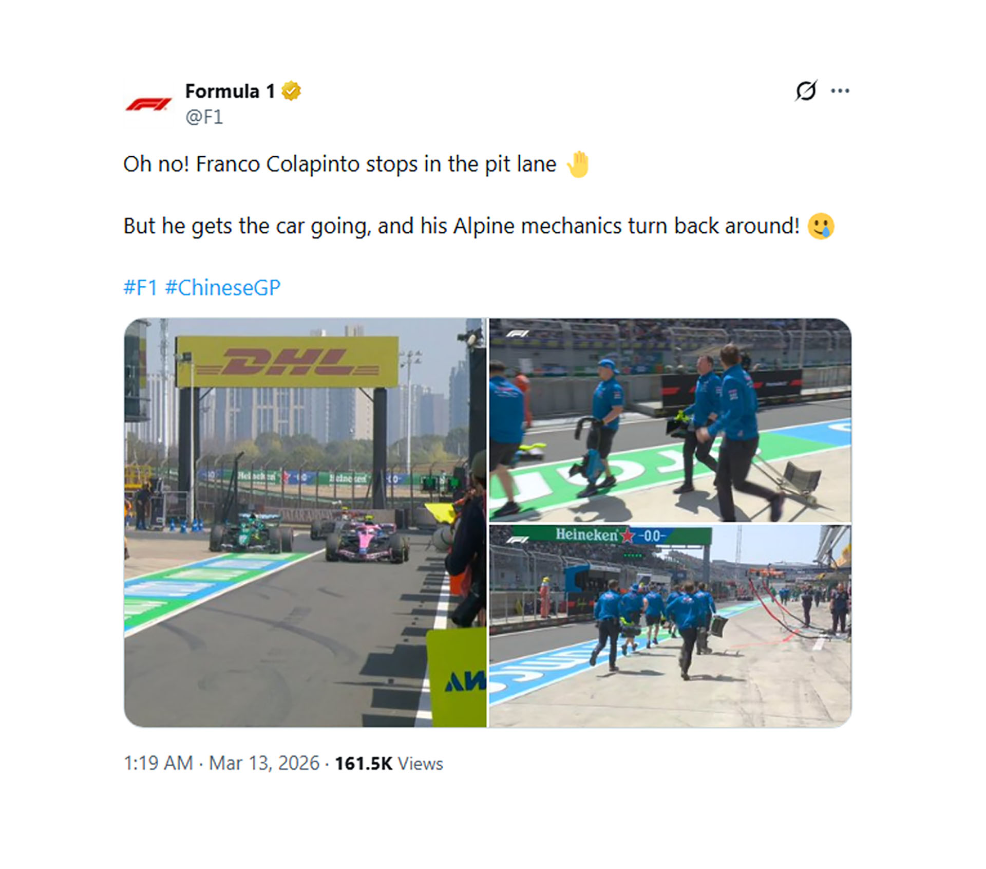 Antes de la clasificación, durante las únicas pruebas libres en Shanghái, el Alpine del argentino se quedó parado en medio de los pits durante varios segundos